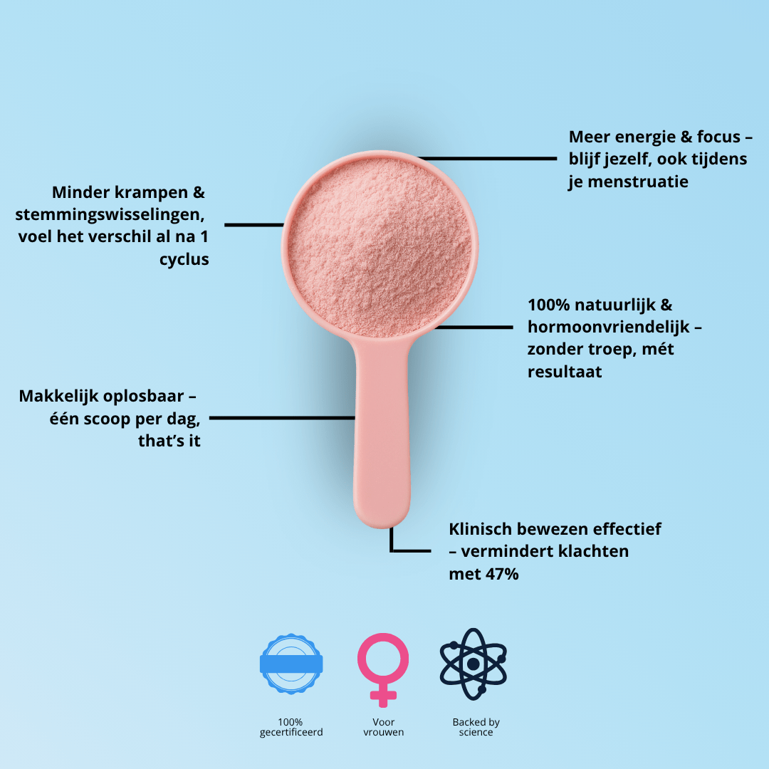 Onze all-in-one formule is speciaal ontwikkeld voor vrouwen die hun cyclus willen ondersteunen op een natuurlijke manier. Boordevol essentiële voedingsstoffen die helpen bij hormoonbalans, energie en een rustig lichaam.