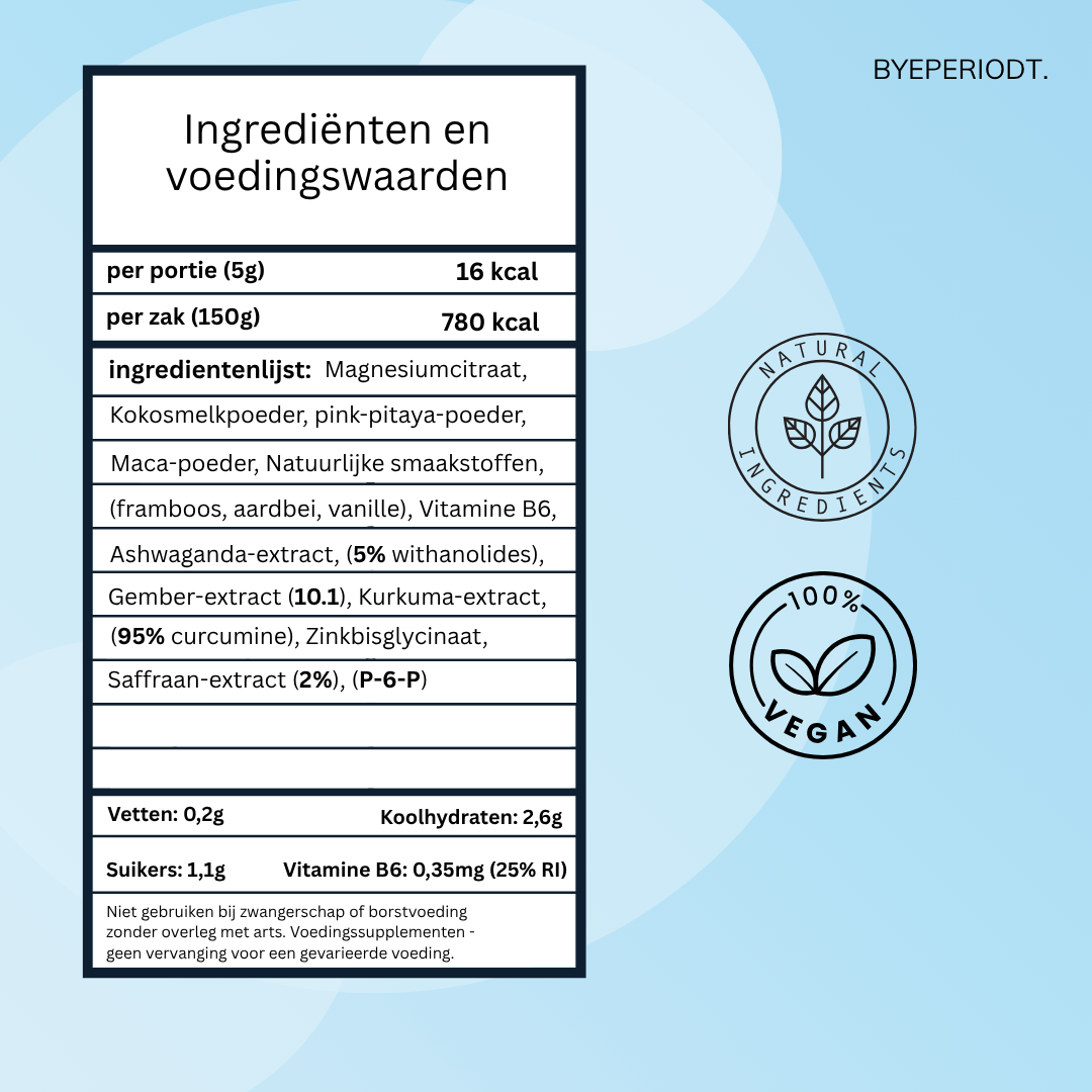 Bij ByePeriodt geloven we in selfcare die écht werkt — en in volledige transparantie. Onze formule is samengesteld uit zorgvuldig gekozen ingrediënten die je ondersteunen tijdens je menstruatie, zodat jij je elke dag energiek, gebalanceerd en comfortabel kunt voelen.
